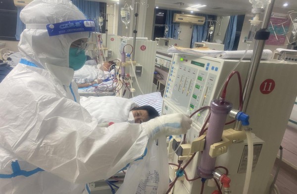 血透患者因自身免疫力降低,在外接触源复杂,是新型冠状病毒的高危易感人群,加之血液透析集中治疗的特点,增加了血液透析患者交叉感染的风险。为了控制感染风险,让患者长期有一个舒适、安全的透析环境,我院血透室率先采用热消毒设备进行血液透析系统消毒,保证患者安全透析。每次患者上机前,血透室医护人员严把疫情防控关,检查健康码、行程码、测体温,流行病学调查,手消卫生等工作。同时完成开机自检、安装管路、时刻监测患者的生命体征,注意血流量和静脉压的变化、透析液的温度、流量、浓度、穿刺点有无出血、体温定时测量、内瘘和导管护理、饮食及疫情健康宣教、并做好终末消毒等等……坚持做好每个细节,因为在这儿,每一件事看似再平常不过的小事,都是关系患者生命的大事,每天做着“重复不变”的工作,每天却又面临着不同的挑战。当患者血液通过透析机循环的一刹那起,4个小时甚至更长的时间,不能有丝毫的马虎。血透医护人员在紧张而又有条不紊的守护好转动的血泵,不断为血透患者开辟生命之路。