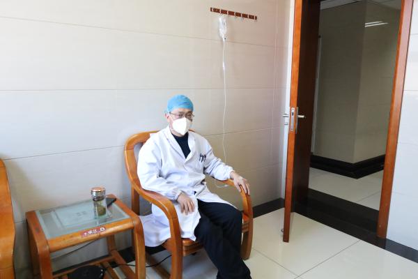连日来的不停轴的工作,又感染新冠,发低烧,咳嗽,全身酸痛,一直坚持着每天在岗,可毕竟不是钢铁之躯,一次抢救过程中,他感觉自己也上气不接下气,浑身出着虚汗,下班后拍个CT,不幸中招——肺炎,就这样王主任打着吊针坚持上班,虽然没有钢铁身躯但却有着钢铁般的意志。
