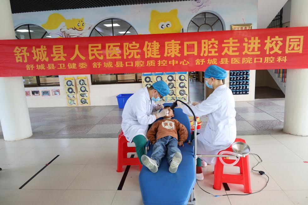 在幼儿园一楼大厅内,牙椅、钠灯、涂氟等所需用品一一摆放就绪,口腔科工作人员默契配合,一人挤压涂氟所需药品,一人现场认真地为3-6岁儿童做涂氟防龋处理。