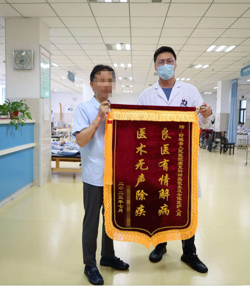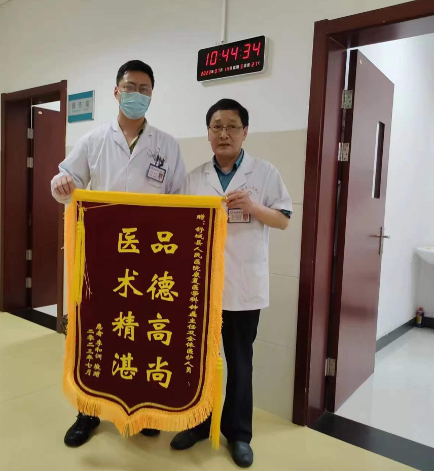 7月19日,表扬电话的第二天,谢先生还是与爱人特地赶来,一再坚持将一面“良医有情解病 医术无声除疾”的锦旗送到钟医生手中,对钟医生及康复科医护人员精心诊治、热情的服务再次表示感谢。