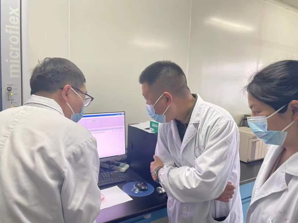 随后,专家换好工作服,工作人员带队深入微生物室了解我们仪器配备情况,对形态学鉴定技巧现场讲解。刘周主任又特地查看我实验室布鲁克质谱仪使用情况,并就质谱仪保养重点做交流指导。