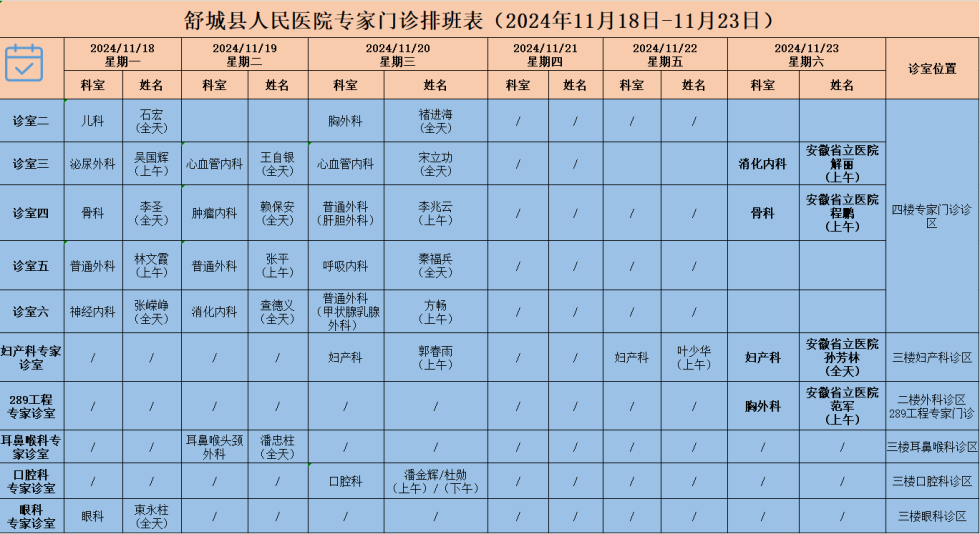 舒城县人民医院专家门诊排班表(2024年11月18日-11月23日)