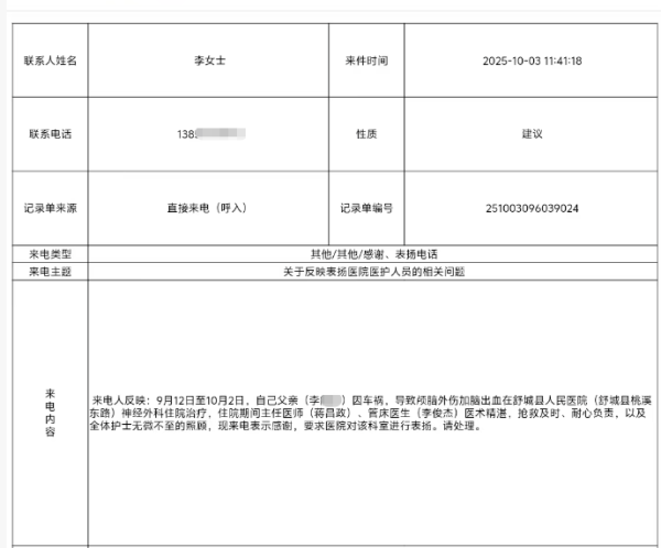 这通12345热线表扬电话,不仅传递了患者家属浓浓的谢意,更是对舒城县人民医院神经外科团队,特别是对蒋昌政主任和李俊杰医生高超医术和崇高医德最直接的褒奖。他们用行动诠释了“敬佑生命、救死扶伤、甘于奉献、大爱无疆”的职业精神,为守护人民群众的生命健康树立了榜样。
