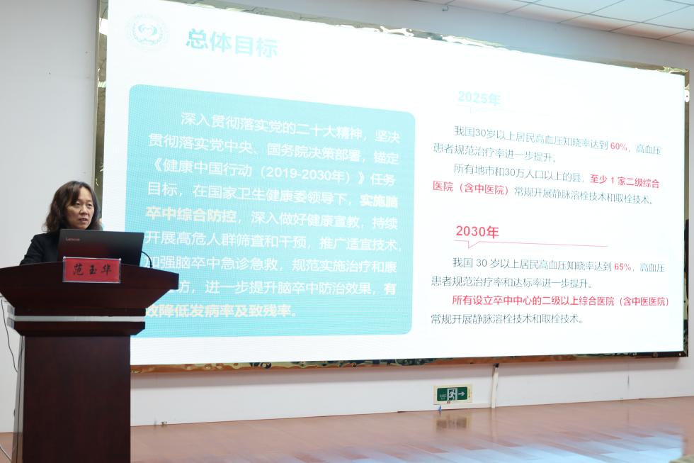 院党委书记陈恳就卒中中心建设工作情况作专题汇报,详细介绍了医院在管理体系、救治流程、技术创新等方面的工作成效与发展规划。范玉华教授以《中国卒中防治与百万减残工程进展》为题作专题培训,系统解读了国家卒中防治工作的最新政策与技术进展。