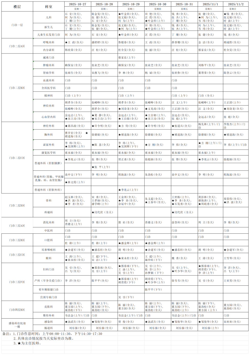 舒城县人民医院门诊排班表(2025年10月27日-2025年11月2日)