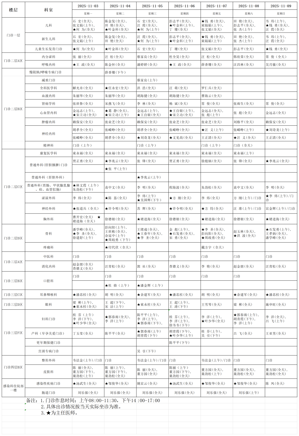 舒城县人民医院门诊排班表(2025年11月3日-2025年11月9日)
