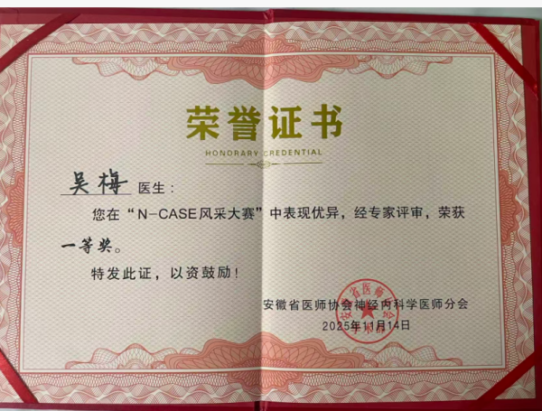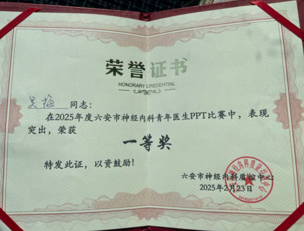 早在2025年2月,吴梅医生就在2025年度六安市神经内科青年医生PPT比赛中表现突出,荣获一等奖,展现了扎实的初步功底。在本次省级大赛的六安赛区初赛及皖中赛区复赛中,她均以第一名的优异成绩晋级。 最终,在2025年11月于合肥举办的省学术年会决赛现场,面对来自全省的顶尖对手,吴梅医生沉着应战,其病例汇报逻辑严密、分析透彻、应答如流,赢得了评委专家组的高度评价,最终荣膺省级总决赛第一名,实现了从市赛到省赛的“大满贯”壮举!