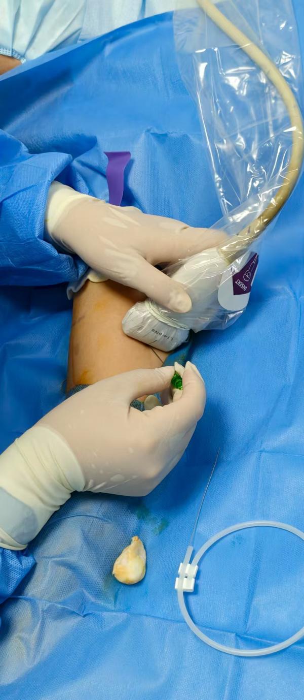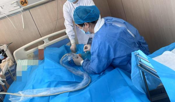 赶到医院后,朱亚林老师没有片刻停歇,立刻来到患者床旁。她首先对患者进行了全面、细致的再评估,亲切地与患者沟通,用专业而温暖的话语缓解其紧张情绪。在充分准备后,她凭借精湛的技术,在B超引导下运用赛丁格穿刺技术,沉着冷静、精准操作,成功为患者置入了中长静脉导管,建立了一条可靠的“生命输液通路”。