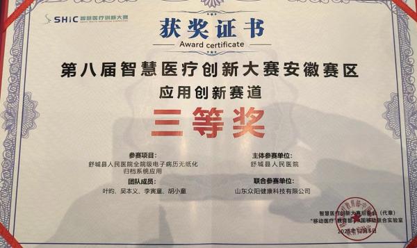 2025年12月5日,第八届智慧医疗创新大赛安徽赛区赛事在淮南圆满落幕。舒城县人民医院凭借“全院级电子病历无纸化归档系统”参赛项目,在全省众多参赛的优质医疗创新项目中崭露头角,成功斩获应用创新赛道三等奖,为医院智慧医疗建设再添重磅荣誉。