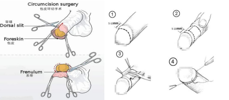 背侧切开包皮环切术------适用于大部分包茎及包皮过长者。