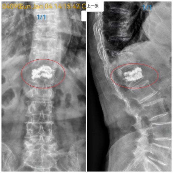 图2:术后腰椎X片检查显示椎体恢复,骨水泥分布良好