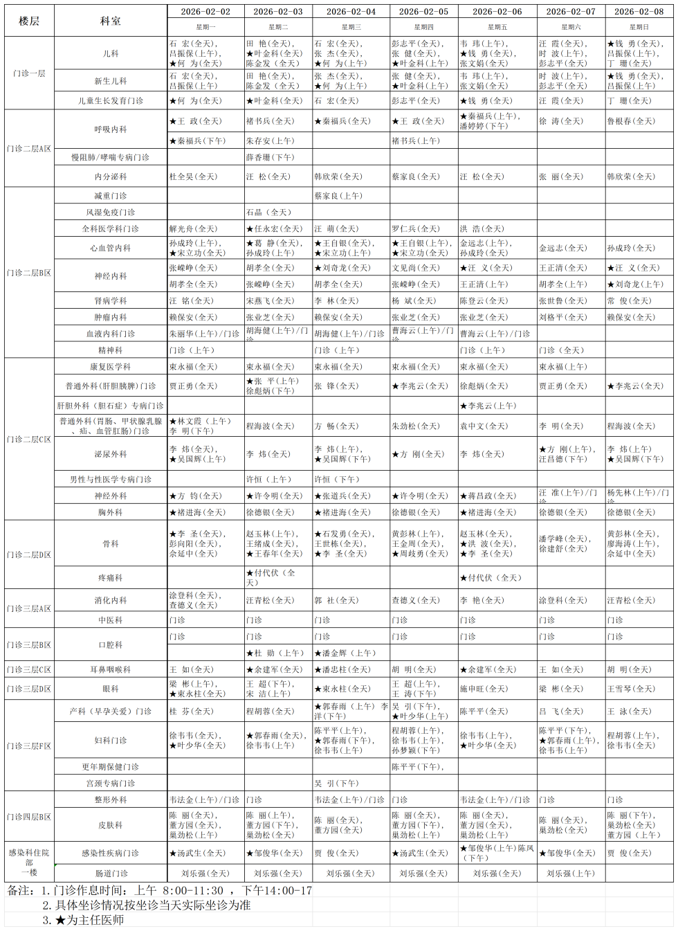 舒城县人民医院门诊排班表(2026年2月2日-2026年2月8日)