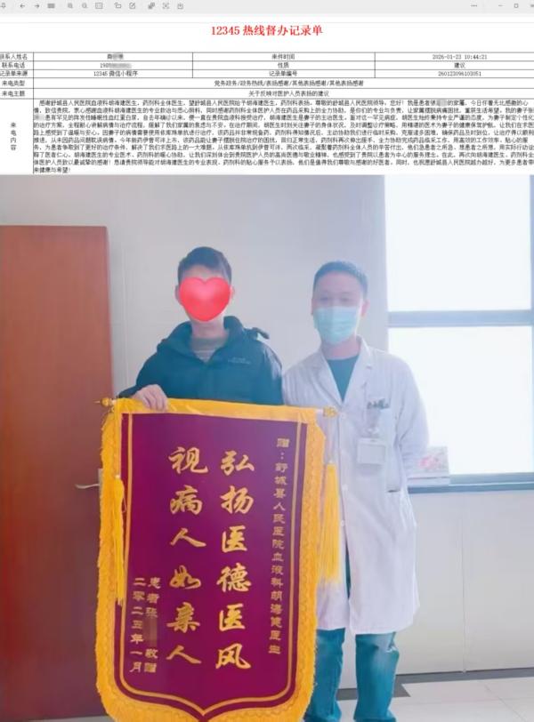 近日,舒城县人民医院收到一份特殊的“12345”政务服务热线工单——商先生通过热线发来感谢信,专门表扬普通内科血液组胡海健医生及药剂科团队,感谢他们对其妻子的精心救治与暖心保障。