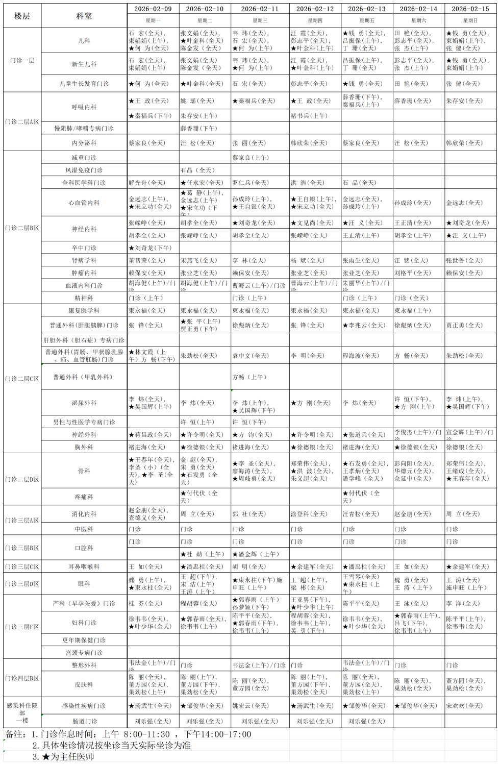 舒城县人民医院门诊排班表(2026年2月9日-2026年2月15日)