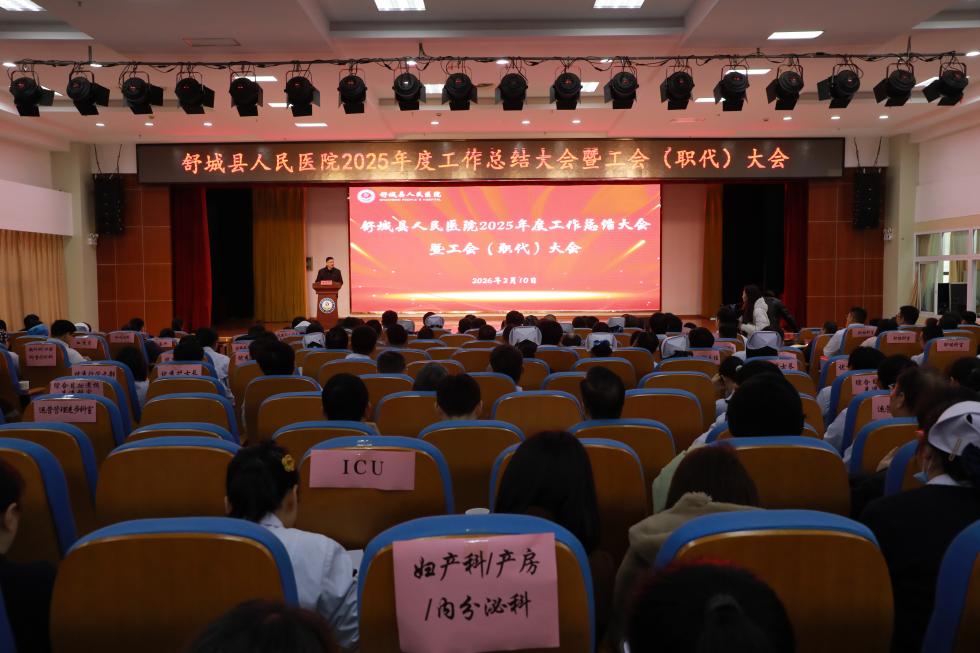 2月10日,舒城县人民医院召开2025年度工作总结大会暨工会(职代)大会。会议全面总结成绩、表扬先进、剖析问题、部署未来。县委卫健工委书记、县卫健委主任、舒城县人民医院医共体集团党委书记赵进出席并作重要讲话,为集团新一年发展指明方向、凝聚奋进共识、注入澎湃动能。医共体集团及医院领导班子成员、各分院院长、中层干部、先进代表及职工代表参会。会议由县人民医院医共体集团党委委员、董事会董事、集团常务副总经理、县医院党委副书记王宗胜主持。