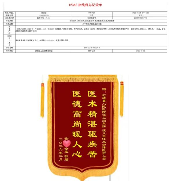 “父亲手术很成功,出院后康复得特别好,我们全家通过12345热线感谢舒城县人民医院神经内科文见尚主任和汪义医生!”2月25日晚,一通特殊的来电打破了热线日常节奏——并非常规求助咨询,而是患者家属满怀感激的“点名表扬”。