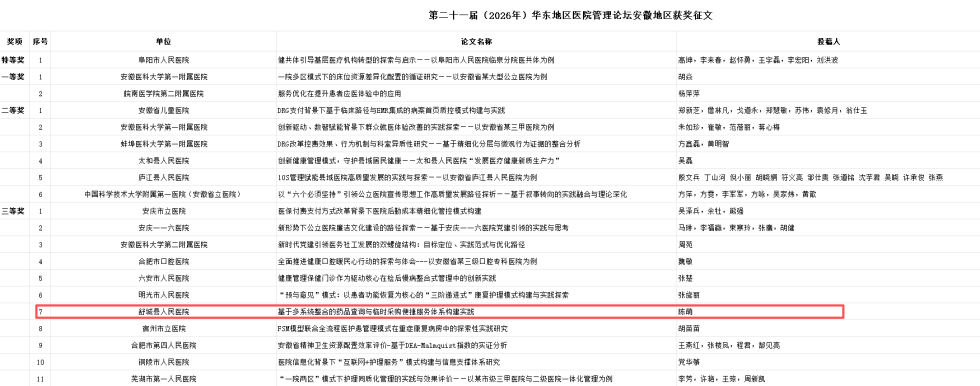 在近日公布的“第二十一届(2026年)华东地区医院管理论坛”安徽地区征文获奖名单中,舒城县人民医院药剂科主任陈萌的论文《基于多系统整合的药品查询与临时采购便捷服务体系构建实践》荣膺三等奖。这一荣誉不仅展现了陈萌在药学服务创新与管理实践方面的深厚思考,也为我院乃至县级医疗机构在医院管理研究领域赢得了宝贵声誉。