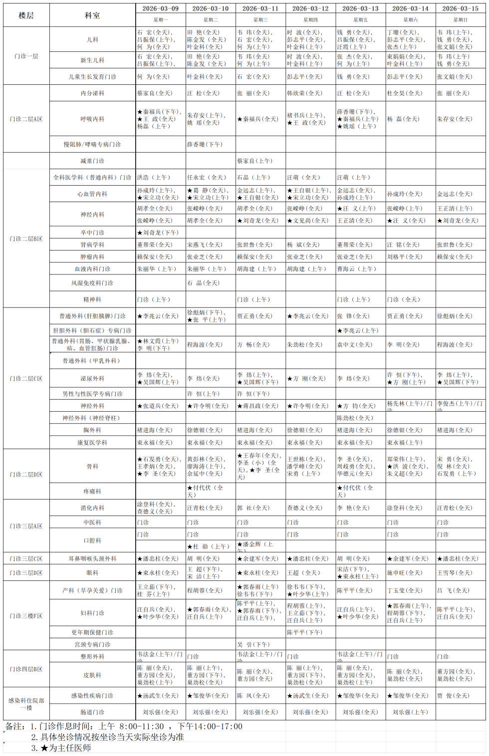 舒城县人民医院门诊排班表(2026年3月9日-2026年3月15日)