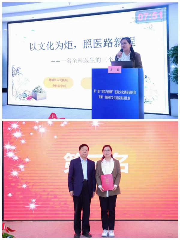 近日,安徽省第一届“理念与创新”医院文化建设研讨会暨演讲比赛圆满落幕。舒城县人民医院全科医学科副主任石晶代表医院参赛,凭借《以文化为炬,照医路新程》的精彩演讲,从全省众多参赛选手中脱颖而出,荣获第三名,充分展现了舒医人深厚的文化底蕴与昂扬的精神风貌。